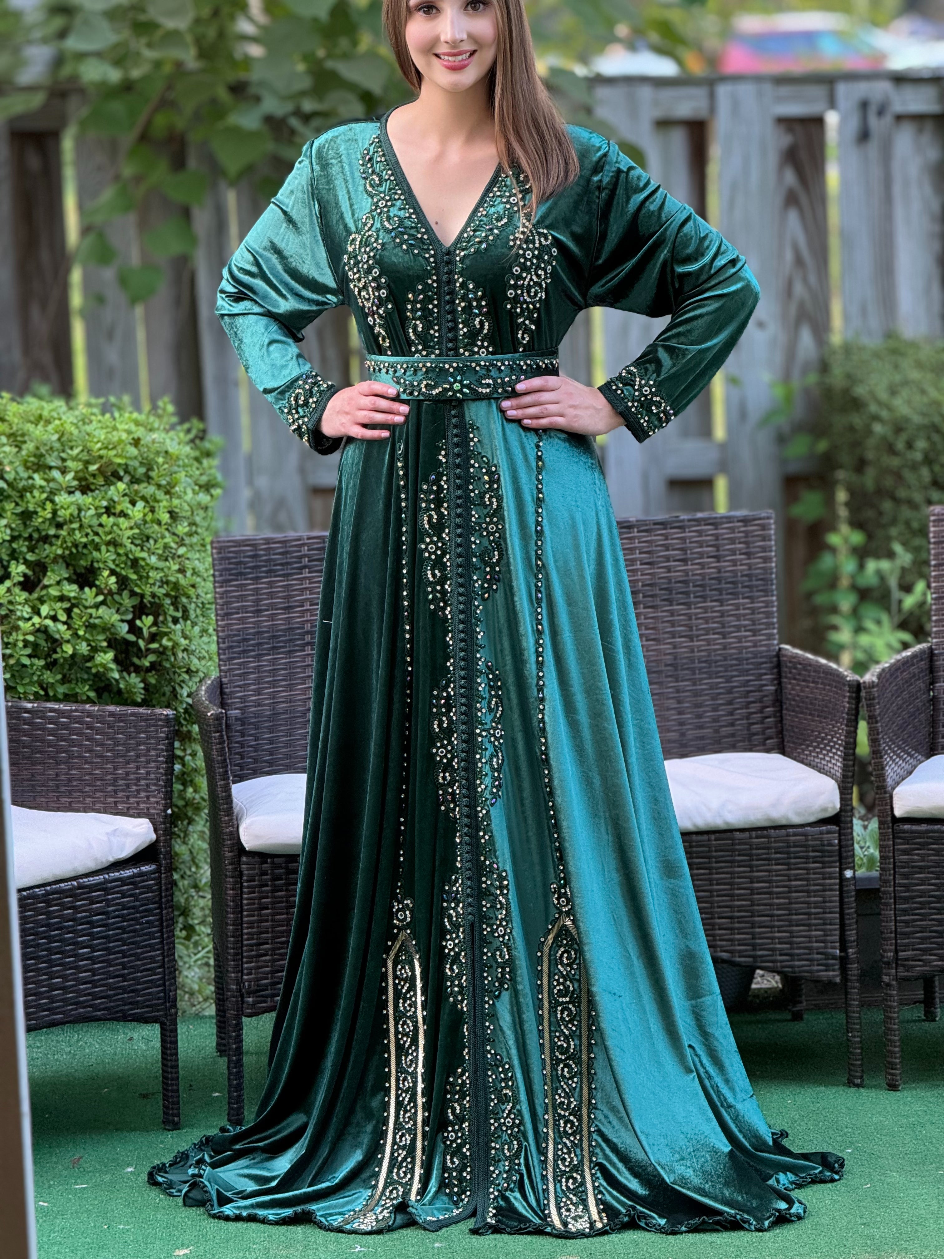 This caftan is a fusion of velvet fabric & traditional Moroccan work