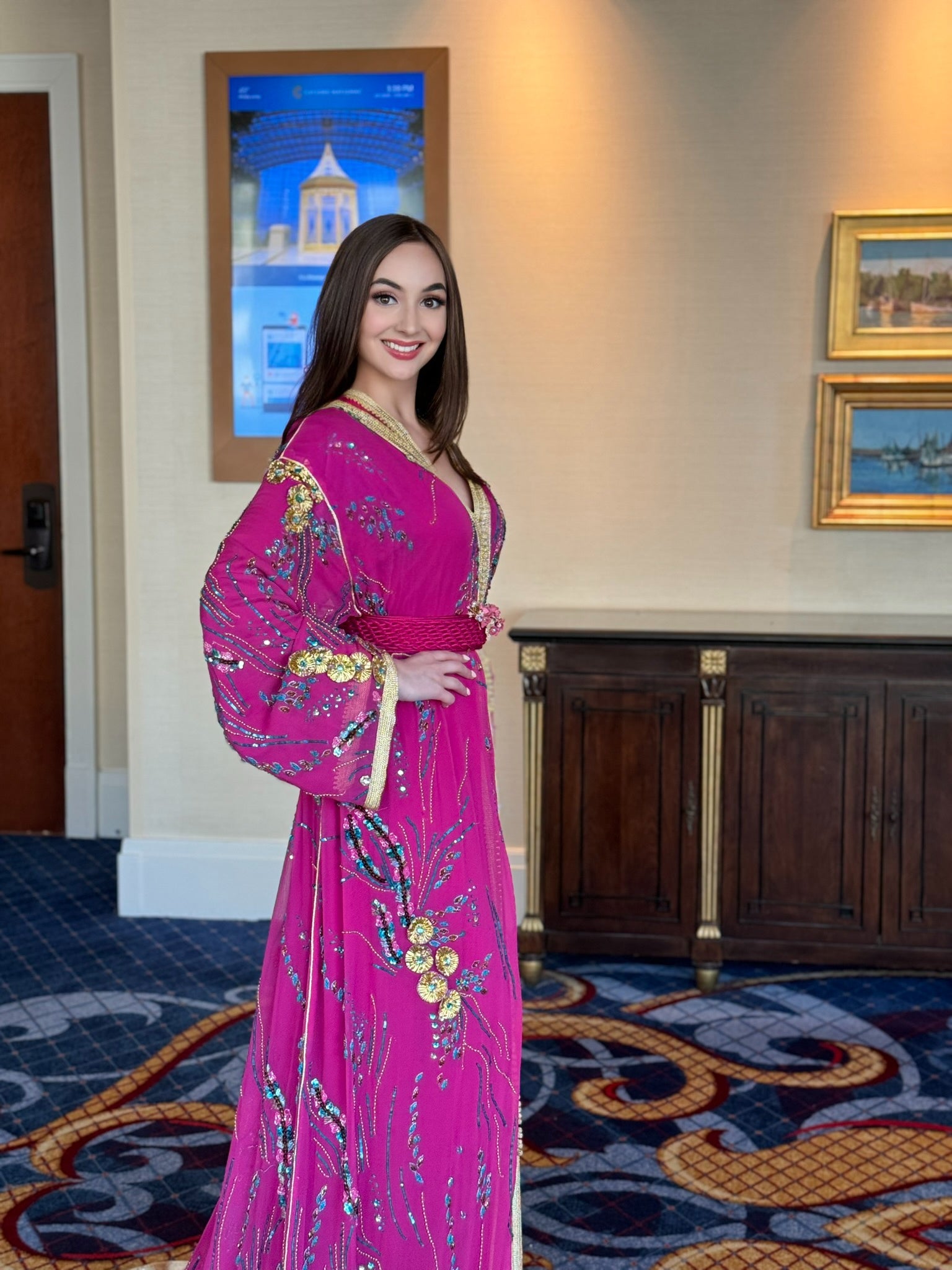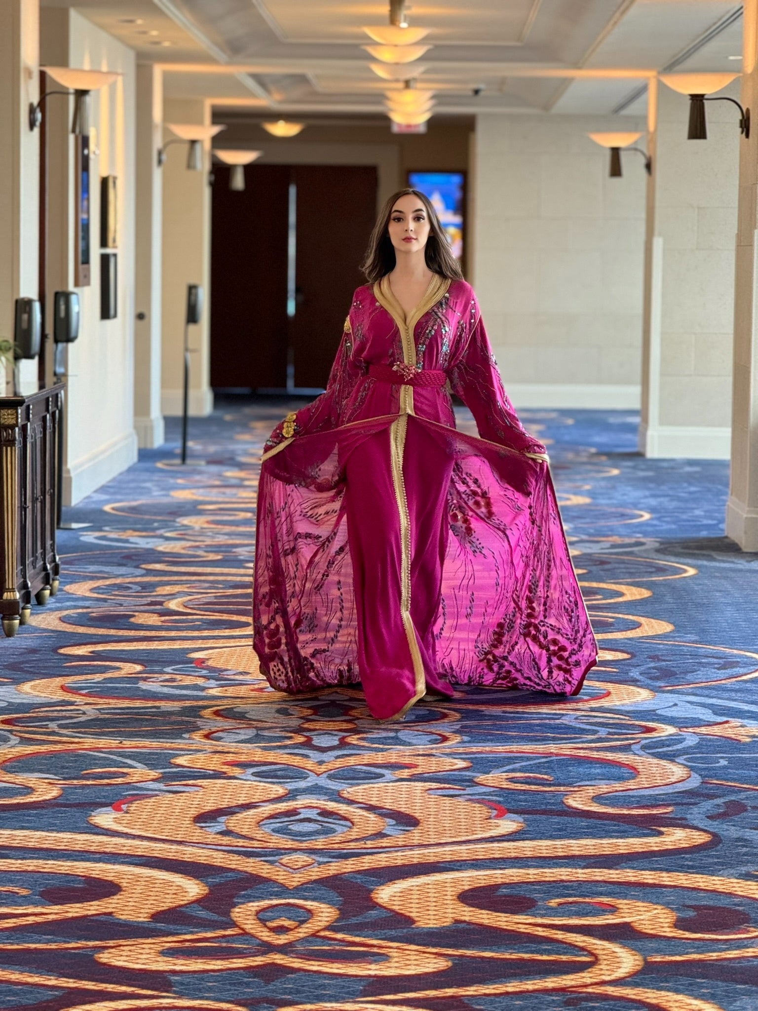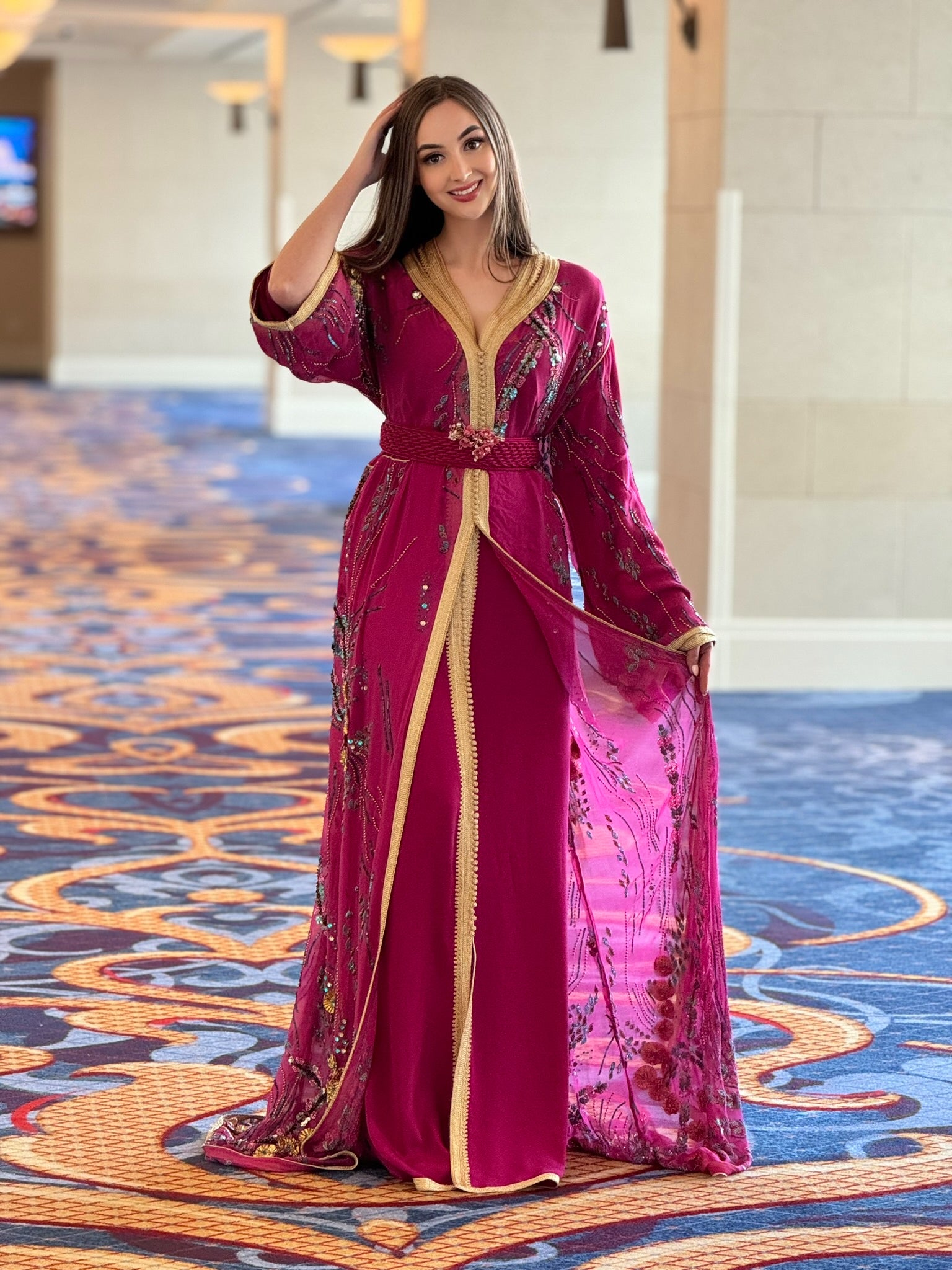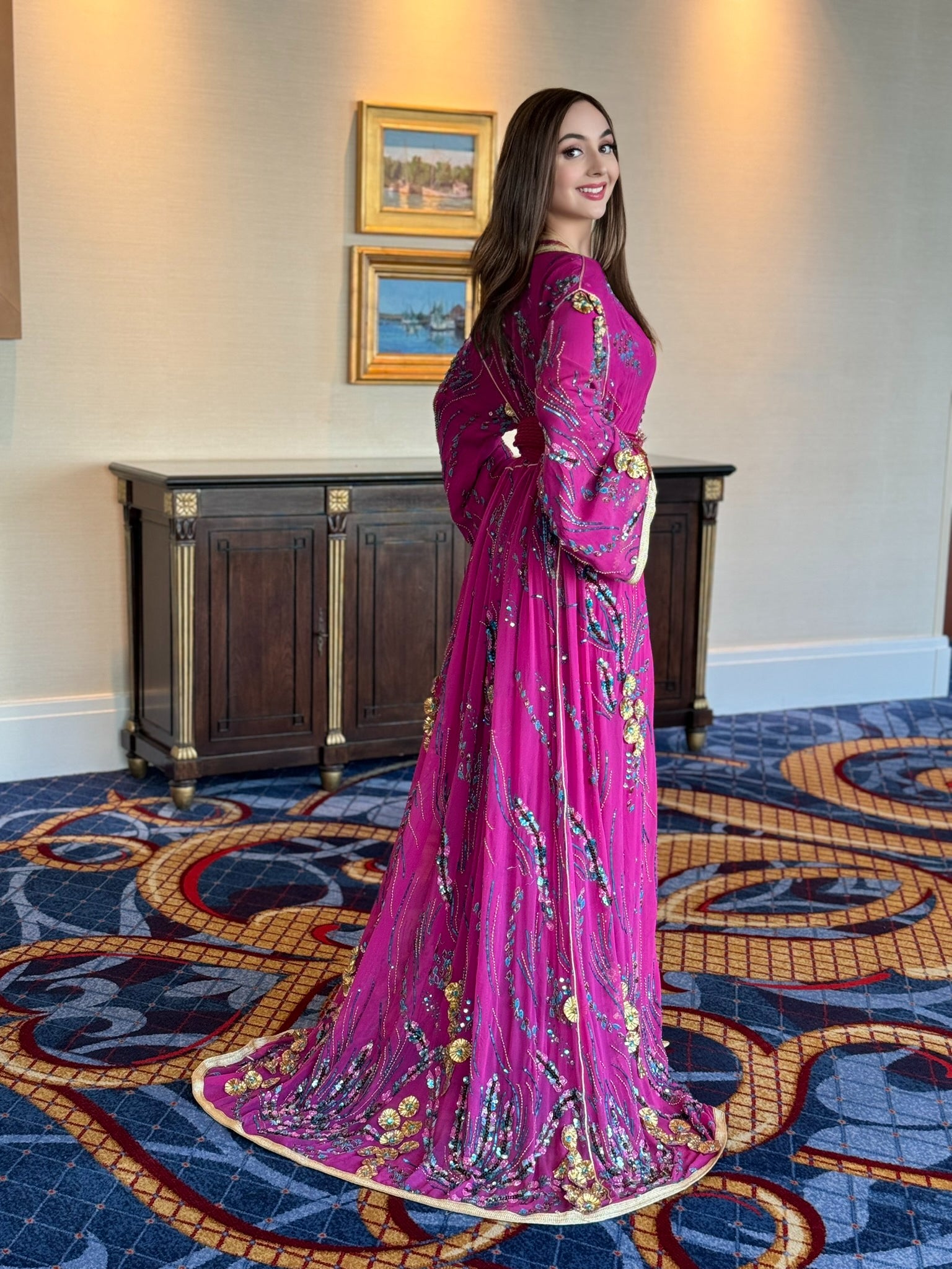 This Takshita is a fusion of trend sari / crepe fabric & traditional Moroccan work. Unique and beautiful - a real eye catcher. Beads handmade
