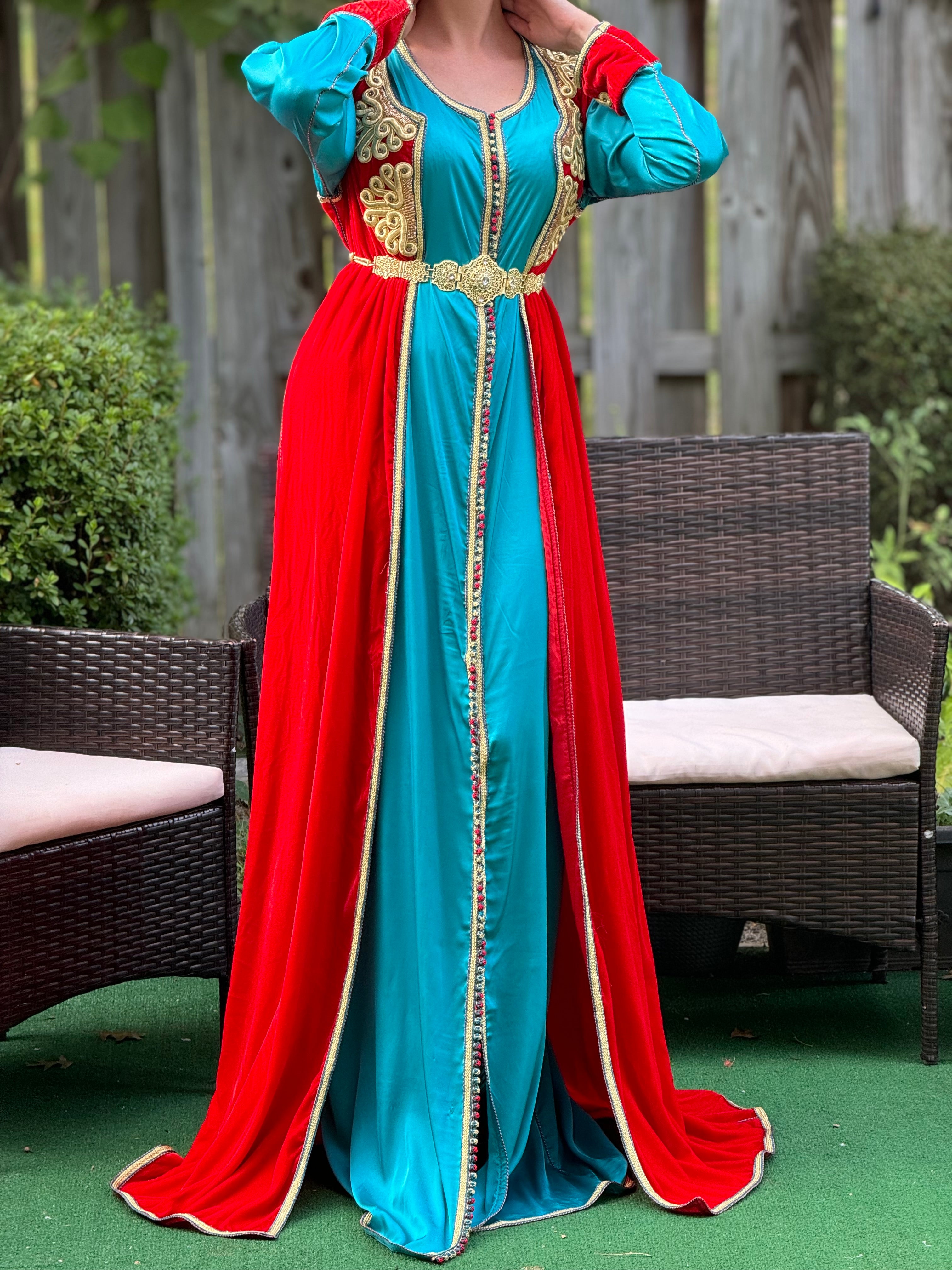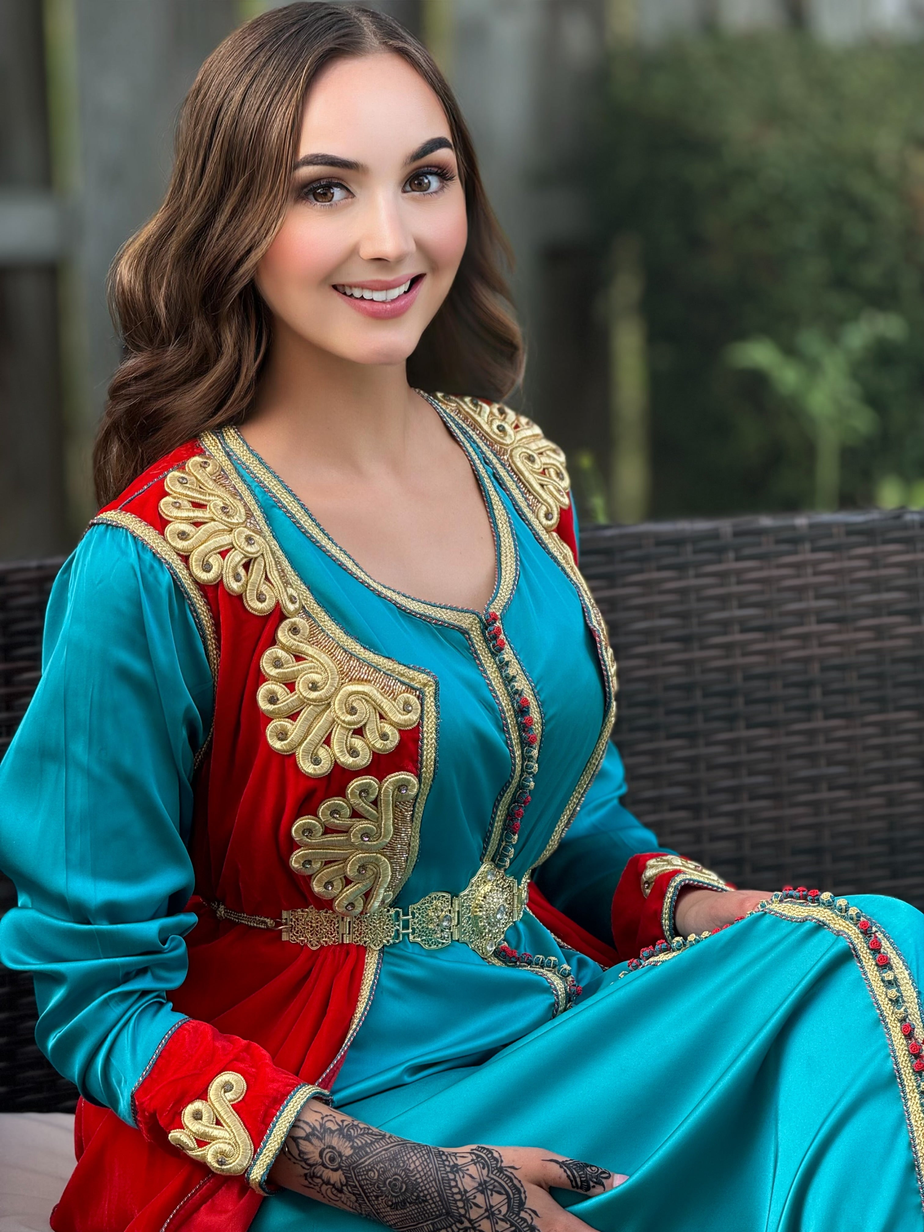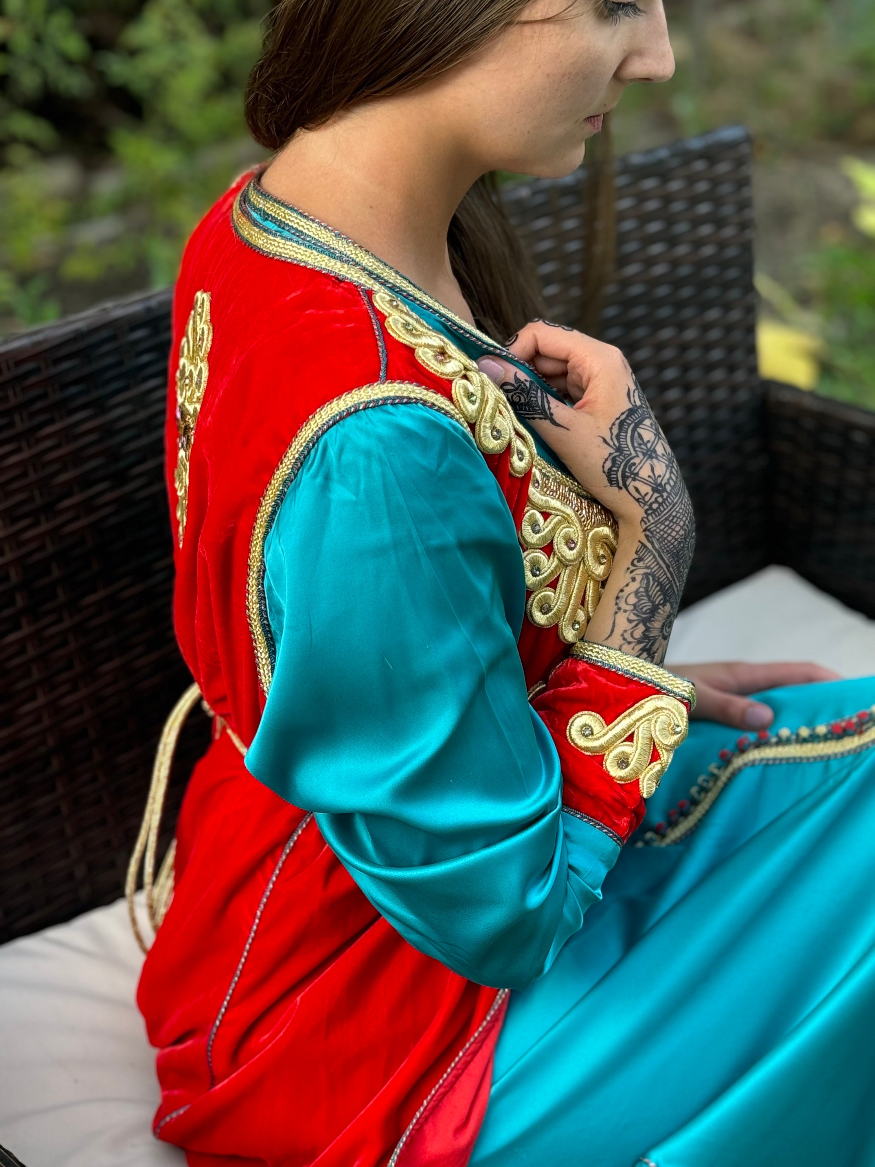 This takshita is a fusion of velvet and satin fabric & traditional Moroccan work. Unique and beautiful - a real eye catcher. ensuring you exude sophistication and charm on any occasion.