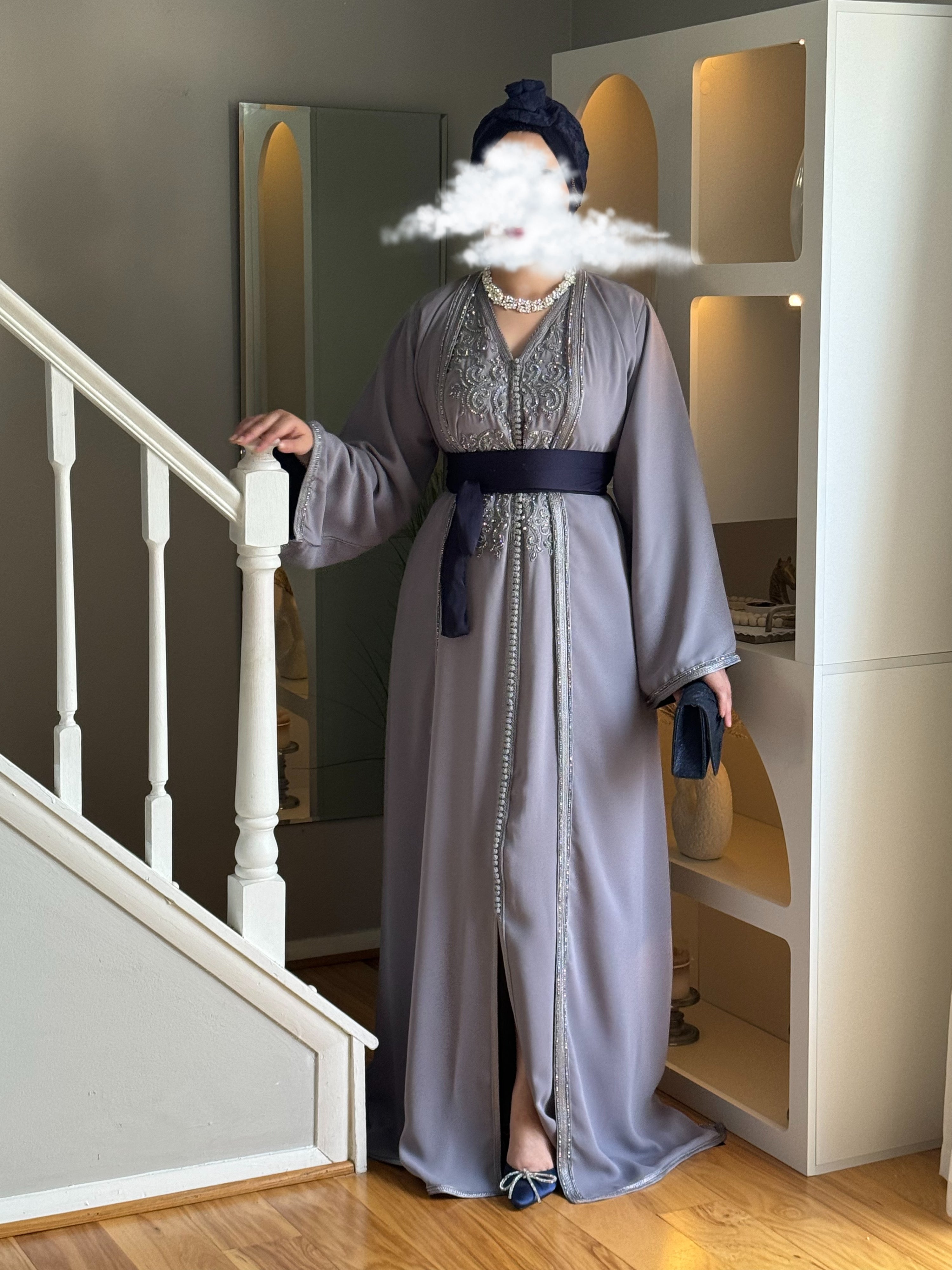 Our exquisitely takshita Lina Color gray with navy blue is influenced by traditional Moroccan styles, providing a refined and luxurious touch to your appearance.caming with belt
