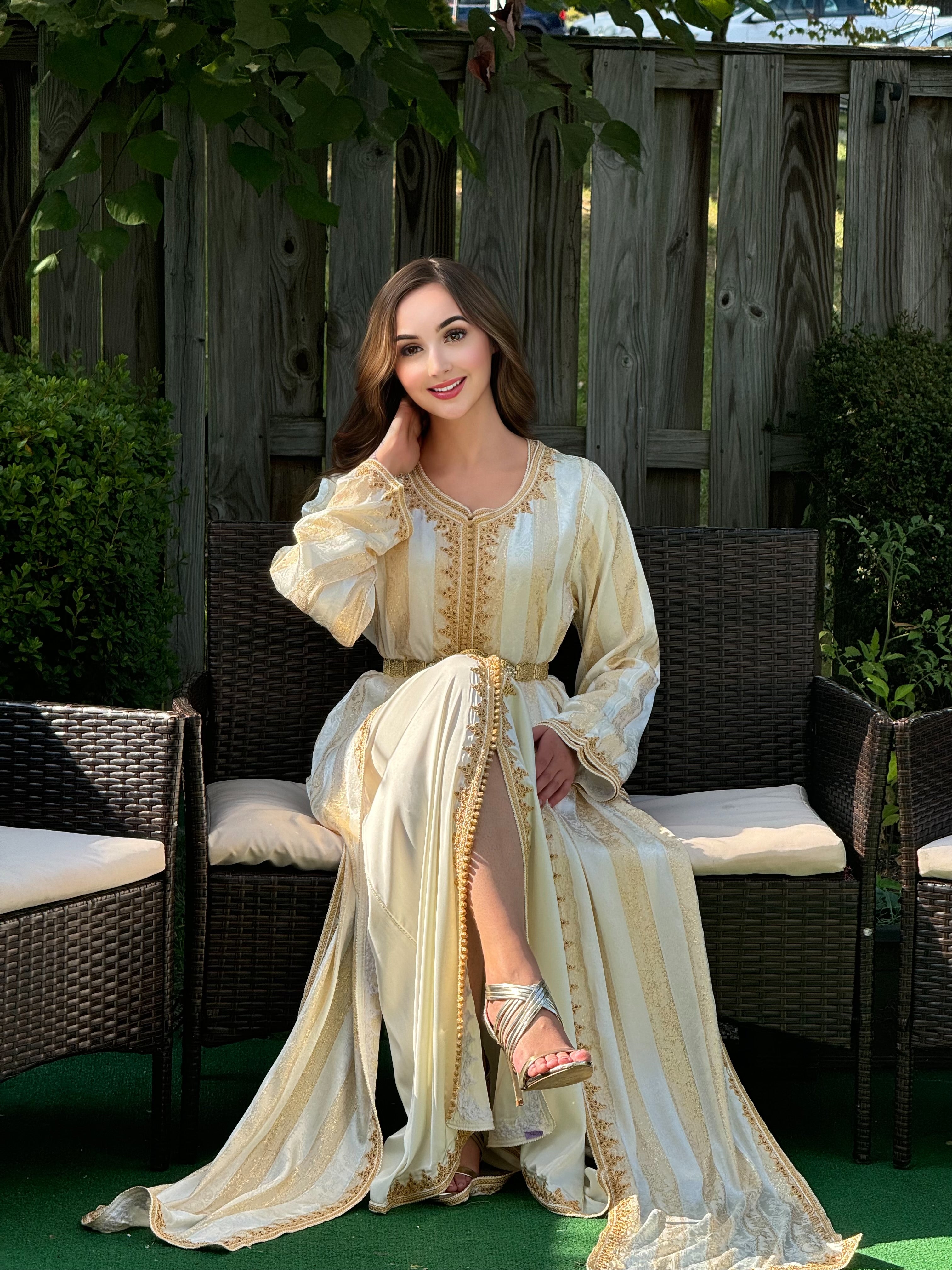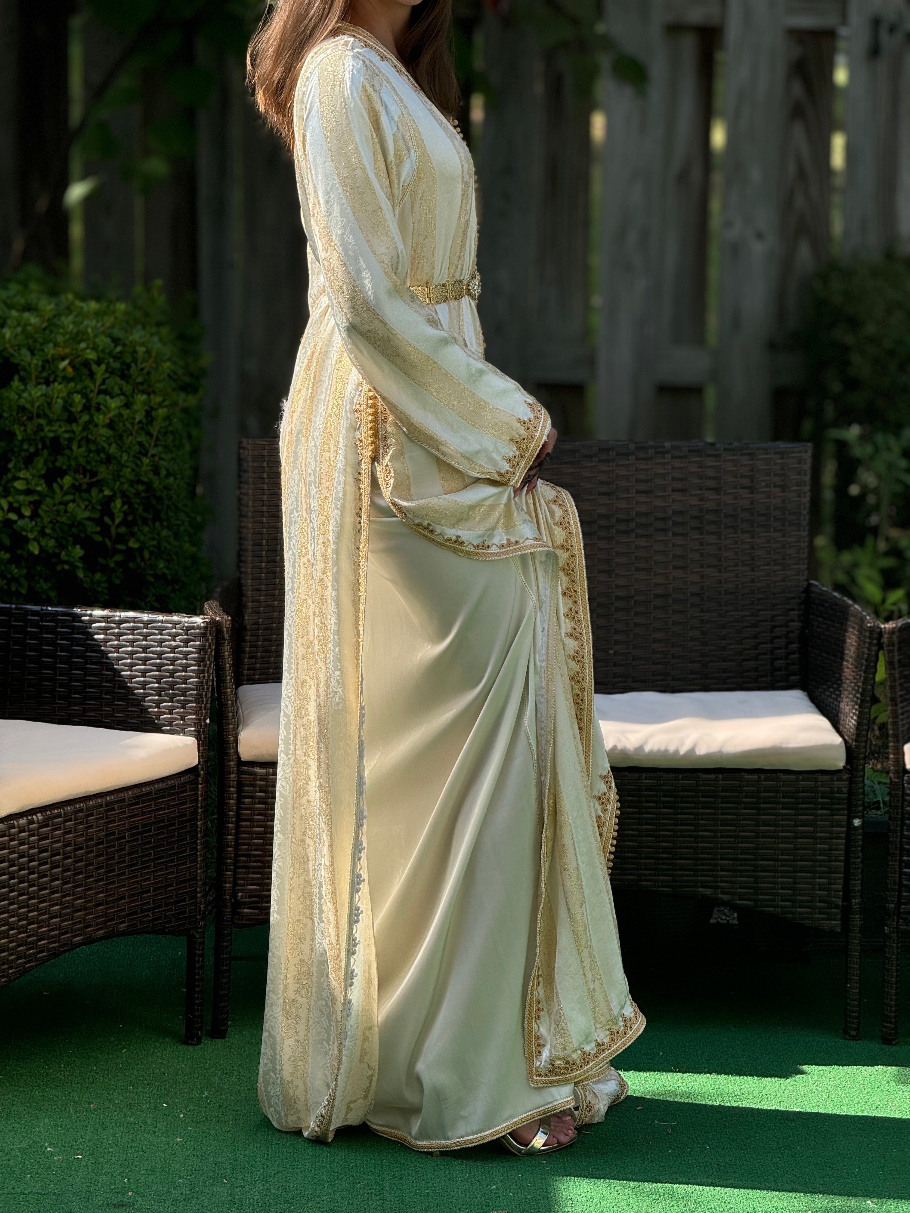 Discover the impeccable craftsmanship of Takchita Maha, made in Morocco with premium materials. This elegant Takchita adds a touch of refinement and enduring elegance to your wardrobe.