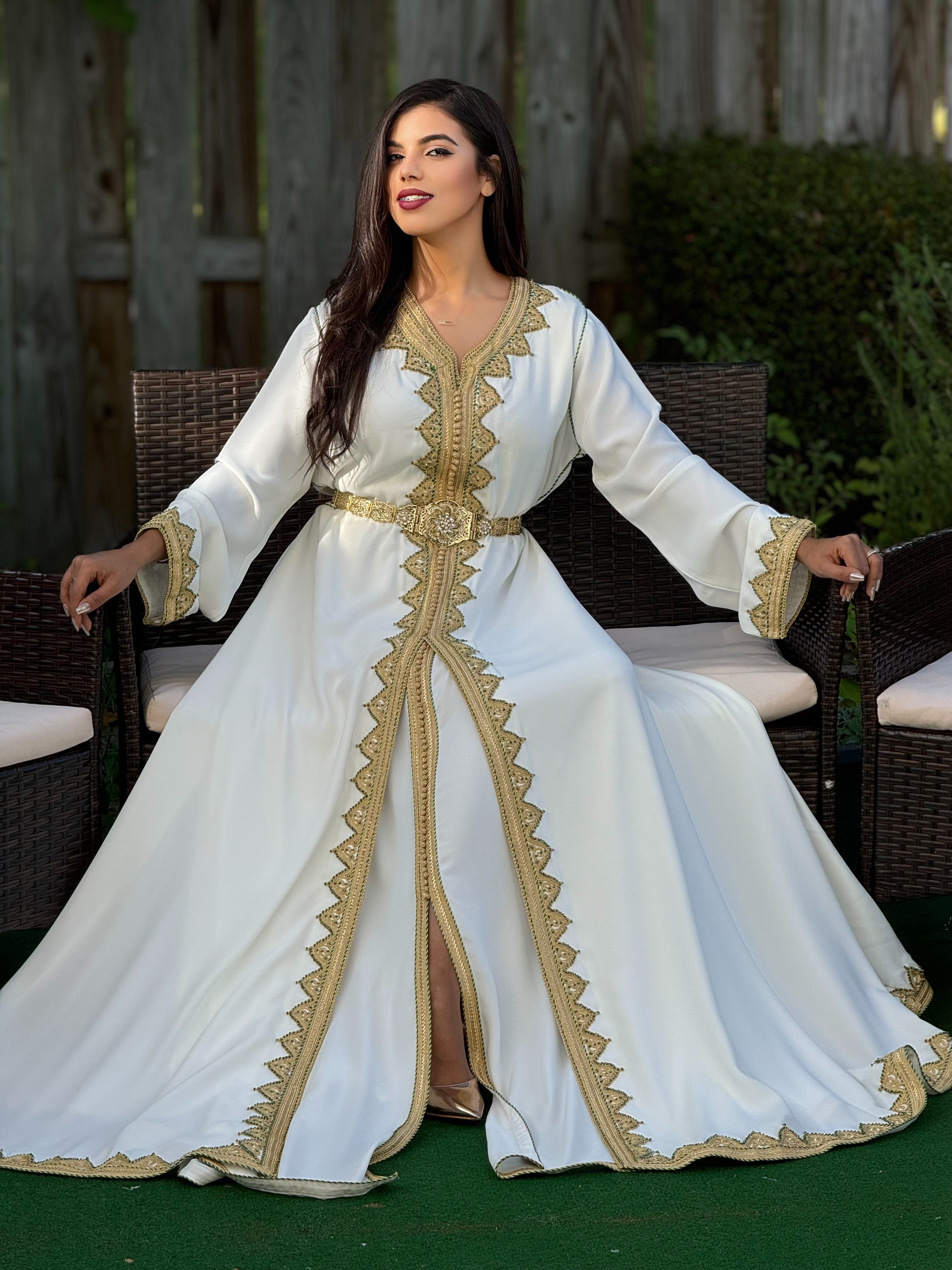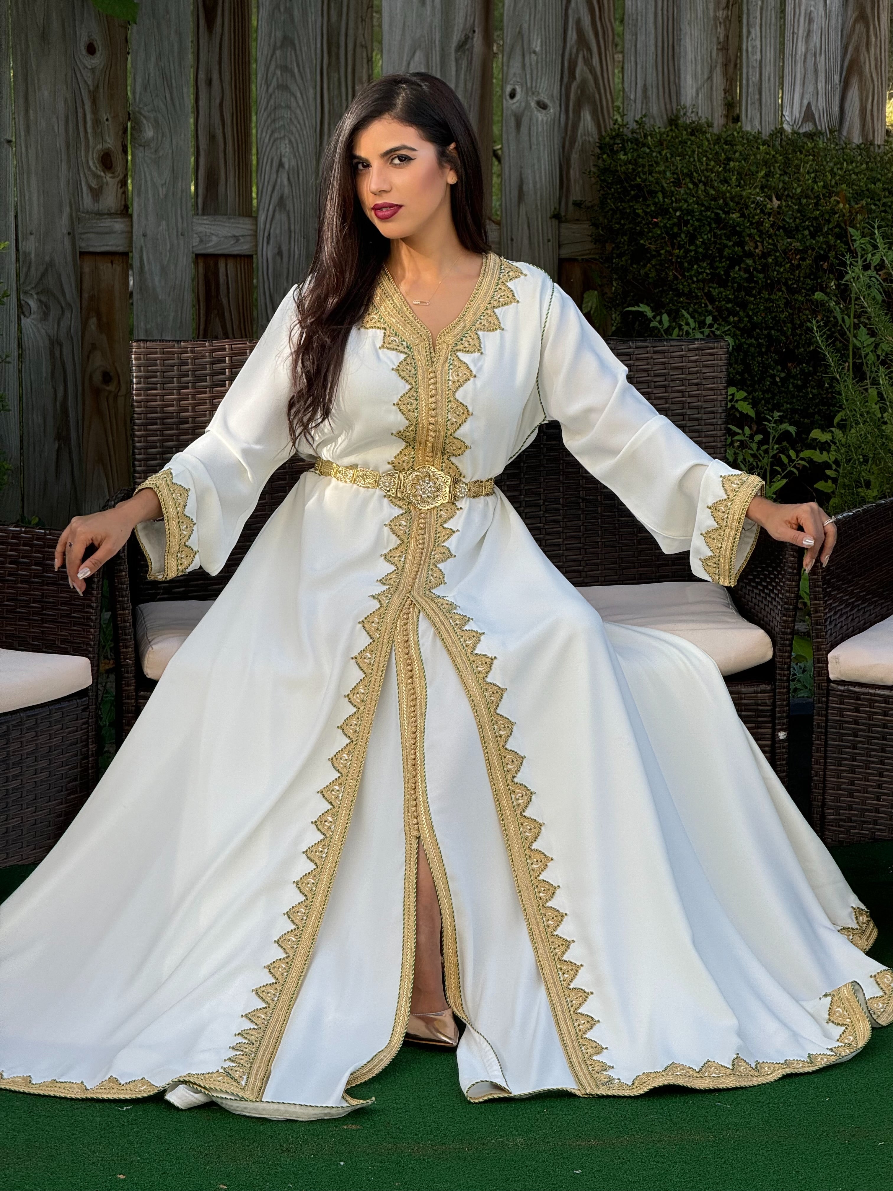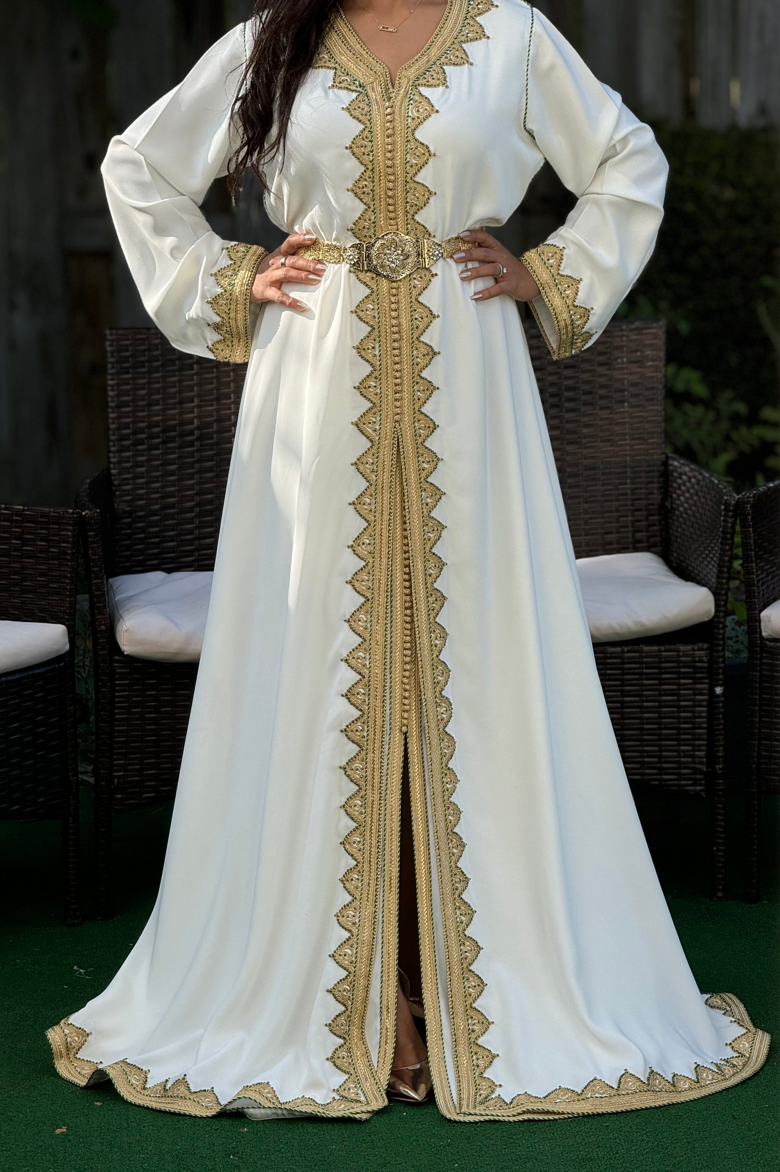 Discover the Takchita soundous, a luxurious Moroccan caftan made with premium crepe material Sophisticated and stylish, this elegant piece adds a touch of luxury for bridal occasion